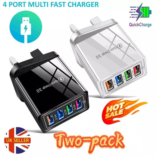 4 Multi-Port Fast Quick Charge USB Hub Mains UK Plug Adapter Wall Charger-2 Pack