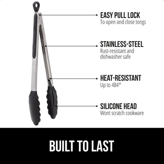 Stainless Steel Heat Resistant Kitchen Tongs for Cooking, 9 + 12 Inch, Set of 2 BBQ Tong, Non Scratch Silicone Tip for Pan, Strong Grip, Grab Food, Toss Salad, Air Fryer, Pull Lock, Black